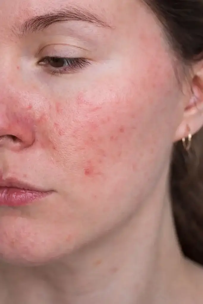 Rosacea is een chronische huidaandoening die zich vooral uit in het gezicht, met name op de wangen, neus, kin en het voorhoofd. De huid vertoont aanhoudende roodheid, wordt snel warm of branderig en kan gevoelig of trekkerig aanvoelen. Bij sommige mensen ontstaan er daarnaast bultjes, puistjes of zichtbare vaatjes. Rosacea verloopt vaak in fases en kan wisselen in ernst.