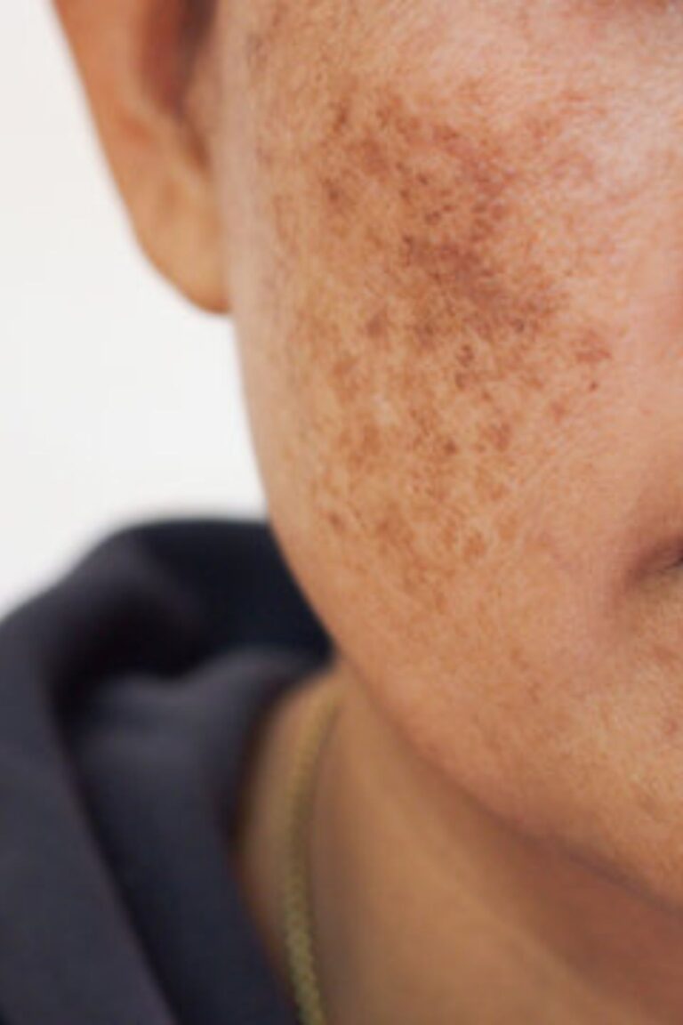 Melasma, ook wel bekend als zwangerschapsmasker, is een huidconditie die soms kan optreden bij vrouwen door bijvoorbeeld hormoonschommelingen, zwangerschap, maar ook de zon. Het wordt gekenmerkt door donkere, onregelmatige vlekken die voornamelijk op het gezicht voorkomen, met name op de wangen, neus, bovenlip en voorhoofd. De aandoening wordt veroorzaakt door een verhoogde productie van melanine, het pigment dat verantwoordelijk is voor de kleur van onze huid, haar en ogen.